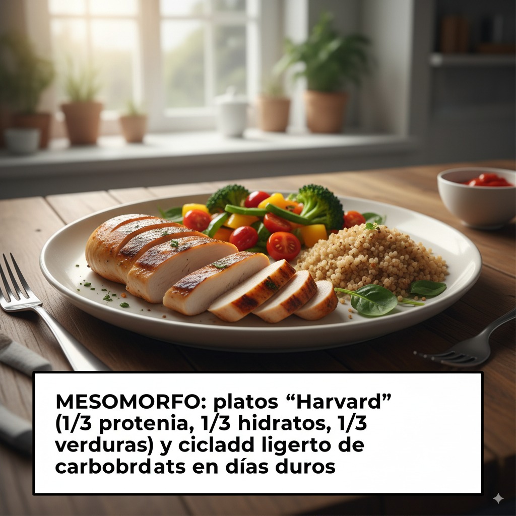 - Mesomorfo: platos “Harvard” (1/3 proteína, 1/3 hidratos, 1/3 verduras) y ciclado ligero de carbohidratos en días duros.