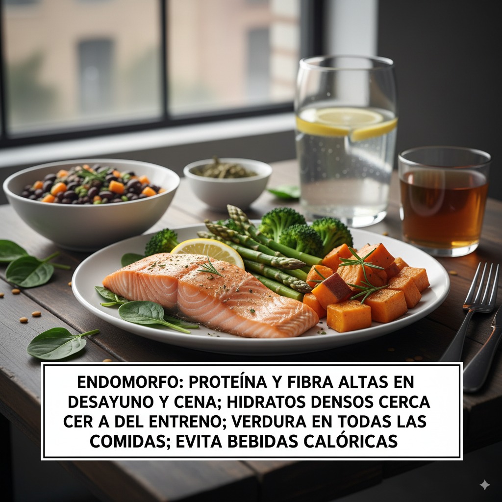 - Endomorfo: proteína y fibra altas en desayuno y cena; hidratos densos cerca del entreno; verdura en todas las comidas; evita bebidas calóricas.