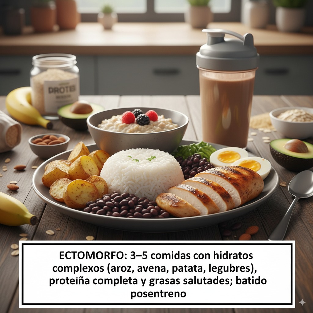 - Ectomorfo: 3–5 comidas con hidratos complejos (arroz, avena, patata, legumbres), proteína completa y grasas saludables; batido posentreno si cuesta llegar a calorías.