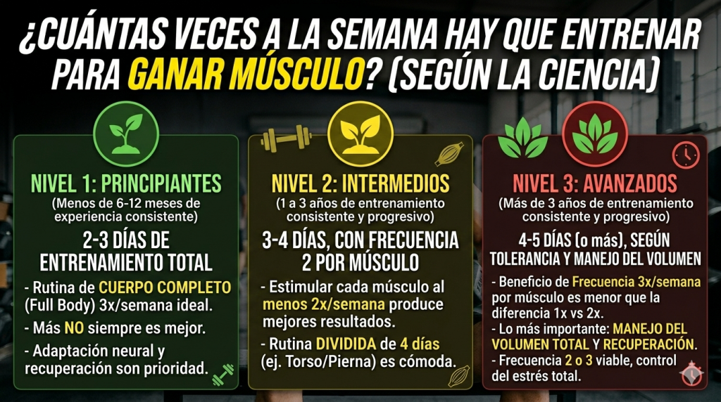 Con 1-3 años de entrenamiento, el consenso científico apunta a que estimular cada grupo muscular 2 veces por semana produce mejores resultados que hacerlo solo 1 vez. Una rutina dividida en 4 días (por ejemplo, torso-pierna) te permite esto de forma cómoda.