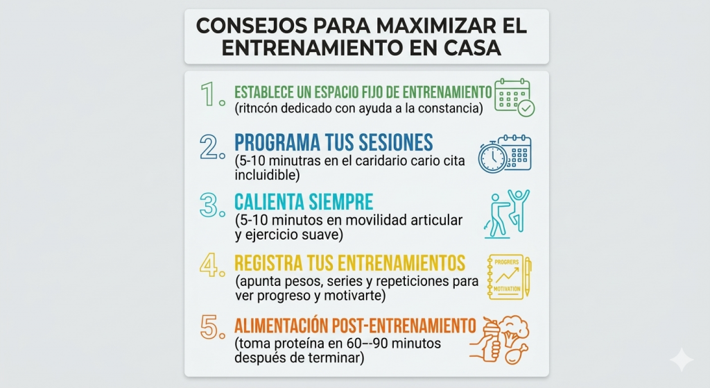 Recuerda que el entrenamiento fuerza en casa es exactamente igual de efectivo que el gimnasio si se hace con consistencia, progresión y una alimentación adecuada.