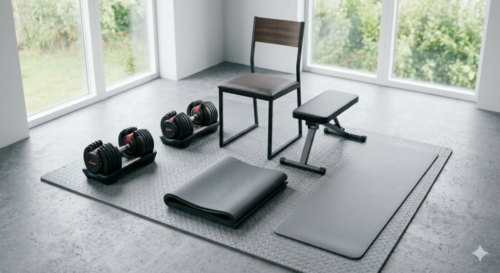 • Un par de mancuernas (o mancuernas ajustables si es posible)